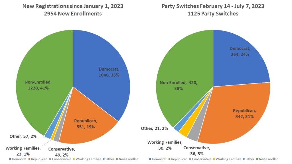 For the first time in my time as Commissioner we can now get date on newly enrolled voters and party changes thanks to our new registration system. The old system we had to compare before and after enrollment numbers that could not give out as accurate information as I would like. As of July 7th, we had 2954 New Enrollments in Onondaga County. Of those new enrollments 1228 (41%) chose not to enroll in any party, 1046 (35%) enrolled in the Democratic Party, 551 (19%) enrolled in the GOP, 57 (2%) enrolled in the other party category, 49 (2%) in the Conservative party and 23 (1%) in the Working Families Party. We had 1,125 Party switches between February 14th and July 7th, 2023. 420 (38%) chose not to enroll in a party, 342 (31%) enrolled as Republicans, 264 (24%) enrolled as Democrats, 36 (3%) enrolled as Conservatives, 30 (2%) enrolled as Working Families, and 21 (2%) in the other category. Clearly the Non-enrolled are continuing to gain ground in our county. Though the GOP had a small edge in party switches that is wiped out by the Democrats gain in newly enrolled voters.