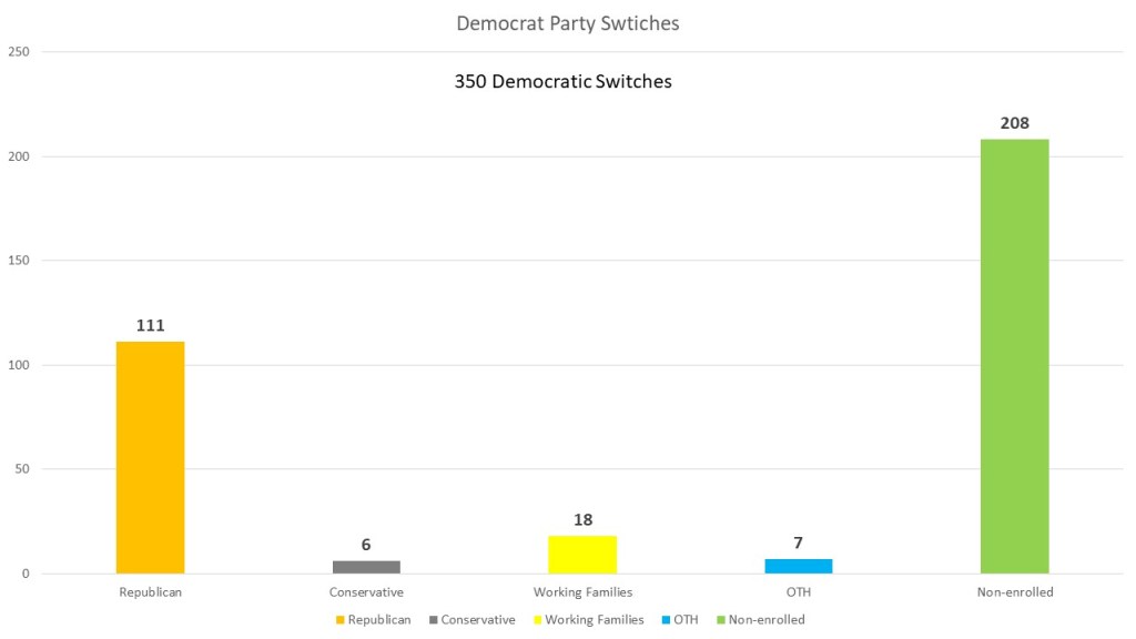 350 people chose to leave the Democratic Party. Of those that left 208 chose not to be enrolled in any party. 111 Switched to the Republican Party, 18 to the Working Family Party, 7 enrolled in the other party category, 6 enrolled in the Conservative Party. Once again, the non-enrolled dominates this category as more voters are choosing not to be part of a party.
