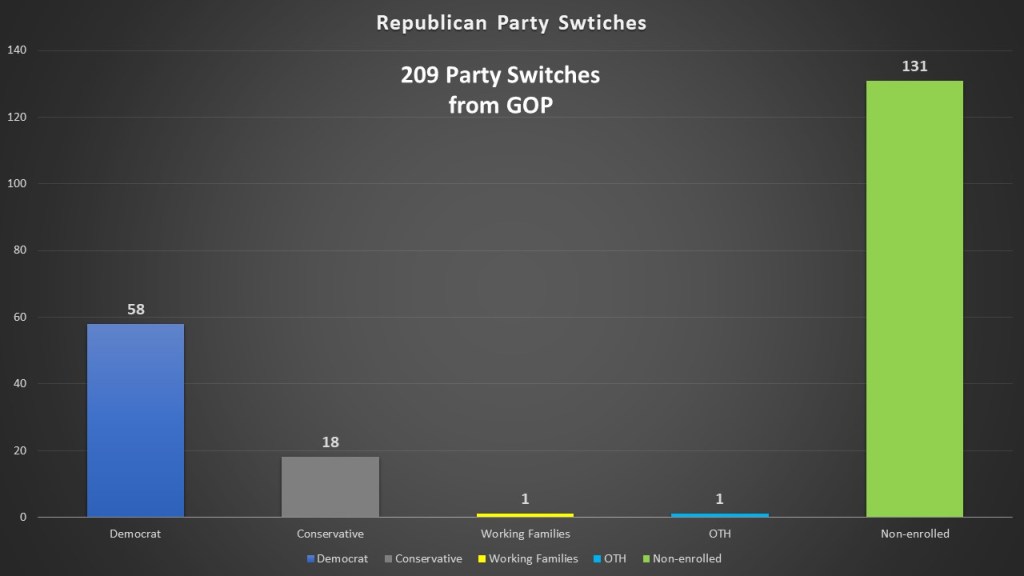209 people switched from the GOP. While less in number that the Democrats, there are significantly less GOP in the county. Once again, the largest number of former GOP, 131, decided to unenroll from any party. 58 decided to switch parties to the Democrats, 18 switched to conservative party, and 1 to Other, and 1 to Working Families. As a percentage 27% switched to the Democrats while 31% switched from Democrat to GOP.