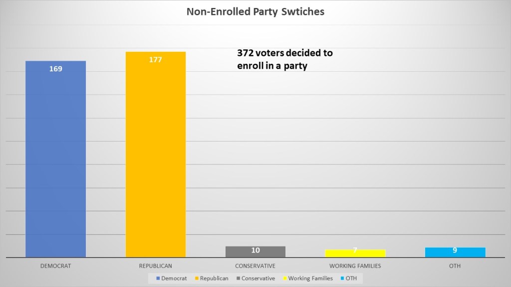 The largest party switch though was non-enrolled deciding to enroll in a party. New York is a closed primary state so often those not enrolled in a party will choose to enroll in a party to take part in the primaries. 177 decided to enroll in the GOP and 169 enrolled as Democrats. Only 28 decided to enroll in other parties (10 Conservative, 7 Working Families, and 9 Others). It seems during this party change period the non-enrolled broke evenly between the GOP and Democratic party.