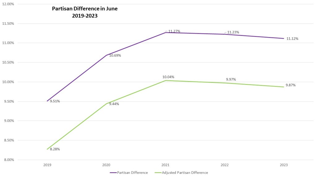 The June primary was established in 2019 so we only have data for where Onondaga County stood in June going back to them. Still, we are seeing more evidence of a leveling off in partisan advantage for the Democrats. During the Trump years the October registration levels showed significant increases for the Democrats, until 2022. We are seeing that in the June registration numbers The Partisan difference (Democrats vs Republican percentage) as well and Adjusted Partisan Difference (Democrats & WFO vs Republican & Conservatives) grew significantly in 2019 and 2020. However, in 2021, 2022, and 2023 we saw a levelling off. Trump being out of the Whitehouse is one of the reasons for this.