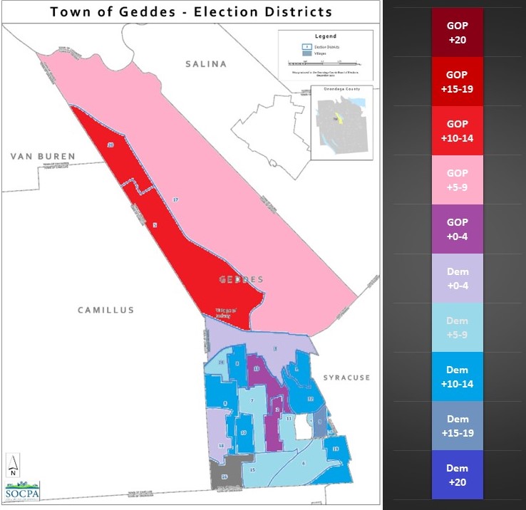 The Town of Geddes sits to the West of the City of Syracuse and borders the southern shore of Onondaga Lake. It is a mid-sized suburban town with 12,153 voters, ranking 9th out of 19 towns and considered the smallest suburban town. The Town of Geddes is considered a purple town, with a trend towards Democrats over the last few years. The makeup of Geddes is 34% Democrat (4,127 Voters), 30% GOP (3,653 Voters), and 29% non-Enrolled (3,490 voters). This year I am breaking down the Towns into as equal as possible regions and Geddes is easily broken into 4 different regions. Northern Geddes considered the Lakeland area (eds 5, 17, & 20) has 2,258 voters (19%). The center of Geddes is the village of Solvay (Eds 1, 3, 4, 9, 12, 13, & 14), the largest village in Onondaga County with 3,956 voters (32%). The Southern portion of Geddes is considered the Fairmount area and for this article I have broken into East and West portions. Eastern Geddes is the Fairmount portion that borders the City of Syracuse (eds 2, 6, 11, 15, & 19) has 2,865 voters (24%). Western Geddes is the portion of Fairmount that borders Camillus (eds 7, 8, 10, 16, & 18) has 3,074 voters (25%).