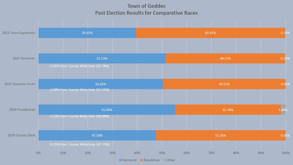 When we look at the comparative races, we see a purple town that fluctuates on even and odd years but consistently votes a few percentage points behind Onondaga County as a whole. In 2022 the Town of Geddes voted for Governor Hochul’s by 51.53%, 2.25% worse than her win in Onondaga County rate of 53.78%. In 2021 the Town of Geddes voted for Anthony Brindisis for Supreme Court by 52.50%, 2.08% worse than the county result rate of 52.50%. In 2020 Geddes President Biden had a significant win in Geddes gaining 55.36% if the vote, but also lost 3.52% points behind his Onondaga County win of 58.88%. In 2019 Cicero voted for Democrat Mark Kolinski for County clerk by only 47.58% losing just 0.15% of his Onondaga County rate of 47.73%, doing the best comparatively. The last head-to-head town office where Democrats contested was Supervisor in 2021 where Democrats lost by over 21%. Local offices still lag the countywide and state offices, especially on odd years.