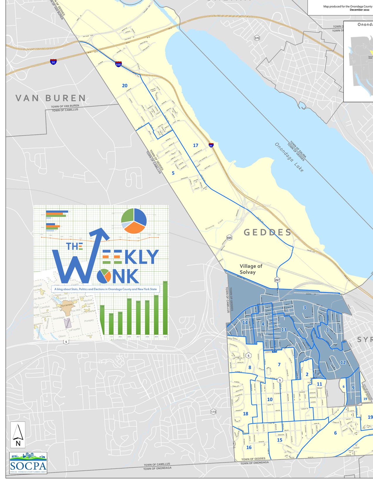 The Town of Geddes sits to the West of the City of Syracuse and borders the southern shore of Onondaga Lake. It is a mid-sized suburban town with 12,153 voters, ranking 9th out of 19 towns and considered the smallest suburban town. The Town of Geddes is considered a purple town, with a trend towards Democrats over the last few years. The makeup of Geddes is 34% Democrat (4,127 Voters), 30% GOP (3,653 Voters), and 29% non-Enrolled (3,490 voters). This year I am breaking down the Towns into as equal as possible regions and Geddes is easily broken into 4 different regions. Northern Geddes considered the Lakeland area (eds 5, 17, & 20) has 2,258 voters (19%). The center of Geddes is the village of Solvay (Eds 1, 3, 4, 9, 12, 13, & 14), the largest village in Onondaga County with 3,956 voters (32%). The Southern portion of Geddes is considered the Fairmount area and for this article I have broken into East and West portions. Eastern Geddes is the Fairmount portion that borders the City of Syracuse (eds 2, 6, 11, 15, & 19) has 2,865 voters (24%). Western Geddes is the portion of Fairmount that borders Camillus (eds 7, 8, 10, 16, & 18) has 3,074 voters (25%).