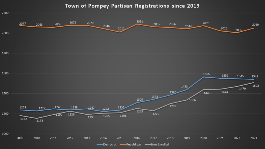 Since 2009 The Town of Pompey registration has had a slow & steady trend towards the Democrats though it remains a solidly red town. The Democrats have gained 304 voters since 2009. The GOP has lost only 28 voters during that time staying basically the same. The Non-enrolled has gained the most with 326 more voters. Like many other communities though, the Democratic gains seemed to have plateaued since 2020. The non-enrolled though have made steady gains since 2016. The N/E may even overtake the Democrats next year.