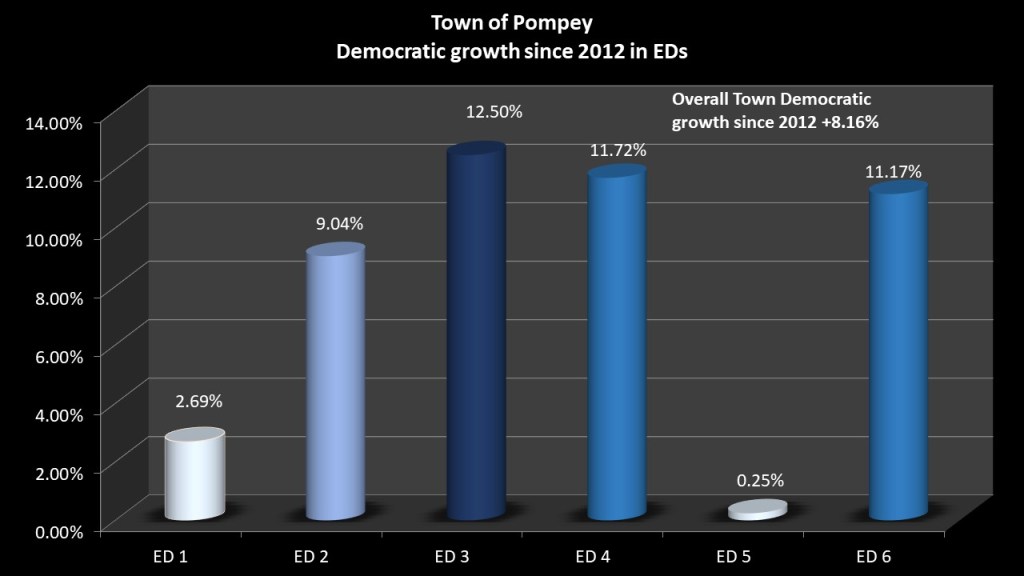 Every ED in the Town of Pompey has trended towards the Democrats since the last redistricting, however some have grown dramatically different than others. Eds 3 & 4 did not just grow in voters the most, they had the most Democratic growth at 12.50% and 11.72% respectively. Following them we saw similar Democratic growth in ED 6 (11.17%) and ED 2 (9.04%). The GOP EDS 1 & 5 has seen the least Democratic growth of 2.69% & 0.25% respectively.