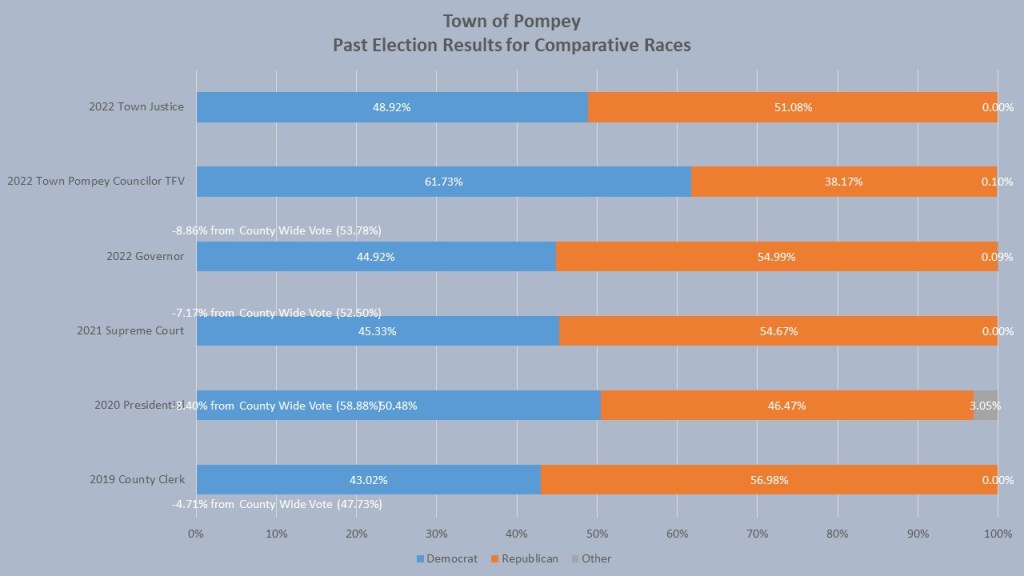 When we look at the comparative races, the Town of Pompey votes significantly behind Onondaga County as a whole. In 2022 the Town of Pompey only voted for Governor Hochul’s by 44.92%, 8.86% worse than her win in Onondaga County rate of 53.78%. In 2021 the Town of Pompey only voted for Anthony Brindisis for Supreme Court by 45.33%, 7.17% worse than the county result rate of 52.50%. In 2020 Pompey voted for President Biden, the only race that got a majority Democratic vote, by 50.48%, but also lost 8.40% points behind his Onondaga County win of 58.88%. In 2019 Pompey only voted for Democrat Mark Kolinski for County clerk by 43.02% losing 4.71% of his Onondaga County rate of 47.73%. The last head-to-head town offices where Democrats contested was for Town Council to fill Vacancy and Town Justice. Democrats won the Town Council TFV 23.56% and lost the Town Justice race by just 2.16%. The Town of Pompey, while voting behind Onondaga County as a whole, does vote more Democratic than their registration would suggest. This indicates that the large and growing non-Enrolled registration is leaning Democratic, specially in races that have more extreme GOP opponents.