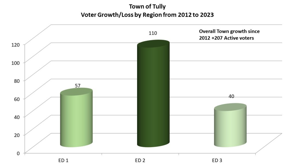 Looking at the growth of voters since the last redistricting cycle we compare it with date from right before redistricting of 2012, the Town of Tully grew by 207 active voters since 2012. The largest growth, by far is in Election District 2 gaining 110 voters. The village of Tully in election district 1 gained 57 voters. Election district 3 gained the least with just 40 voters.