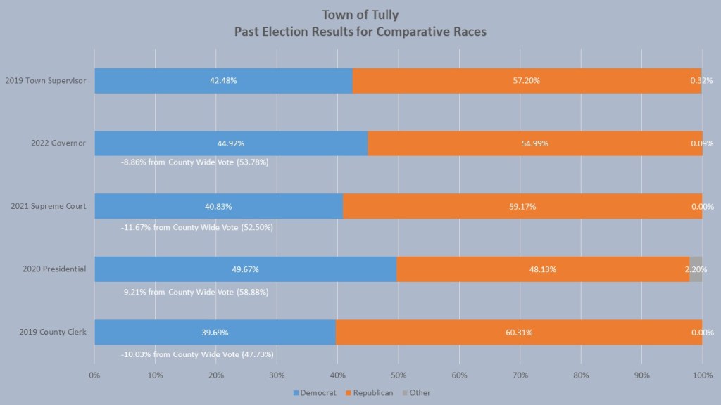 When we look at the comparative races, the Town of Tully, while voting almost solidly GOP, has some surprises. Tully registration is significantly more GOP than Onondaga County, but President Biden won the Town in 2020 by 1.54, though that was 9.21% worse than his county win total. The other comparative races, though won by the GOP, were favorable results when compared to other towns with similar GOP registration advantage. Governor Hochul only garnered 44.92% in Tully, 886% less than her county win total. In his supreme court race in 2021 Anthony Brindisi won 40.83%, 11.67% worse than his Onondaga County totals. In 2019 democrat Mark Kolinski running for Town Clerk faired the worst with just 39.69% of the voter, 10.03% off his Onondaga County total. In 2019 then mayor of Tully Melissa Flint-Morgan challenged Town Supervisor John Masters. Though she did not win, garnering only 4248% of the vote, she did better than the other comparative races in odd number years.