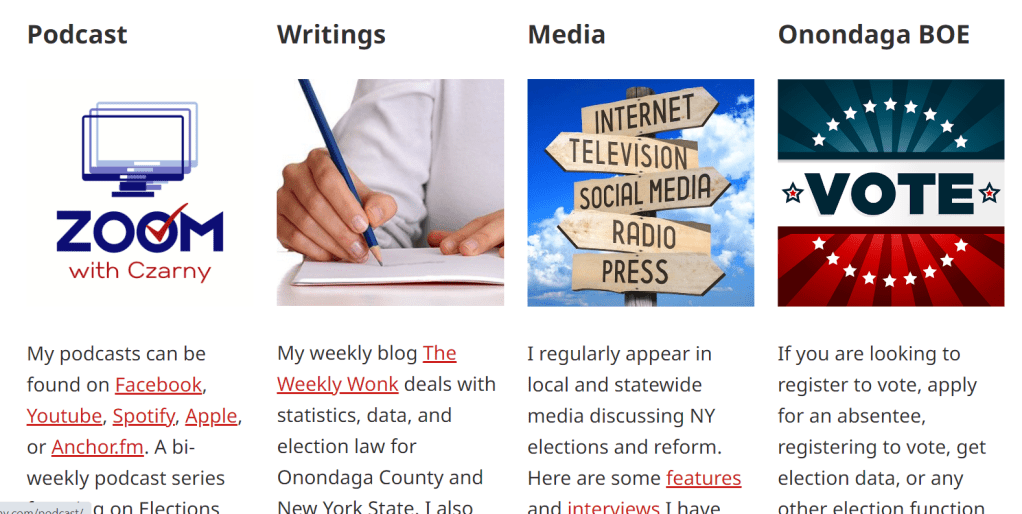 Welcome back to #WeeklyWonk. Each weekend I publish an article on a subject relating to elections in Onondaga County and New York State. Often these articles will have detailed stats to consume but sometimes they will be a recap of a prominent issue or on relevant election law. I have had sporadic offerings since the November general election but now am committed to weekly offerings to be published at dustinczarny.com so we can understand the political landscape and work of the Onondaga County Board of Elections. This week I take a brief look back at my informational website, dustinczarny.com.