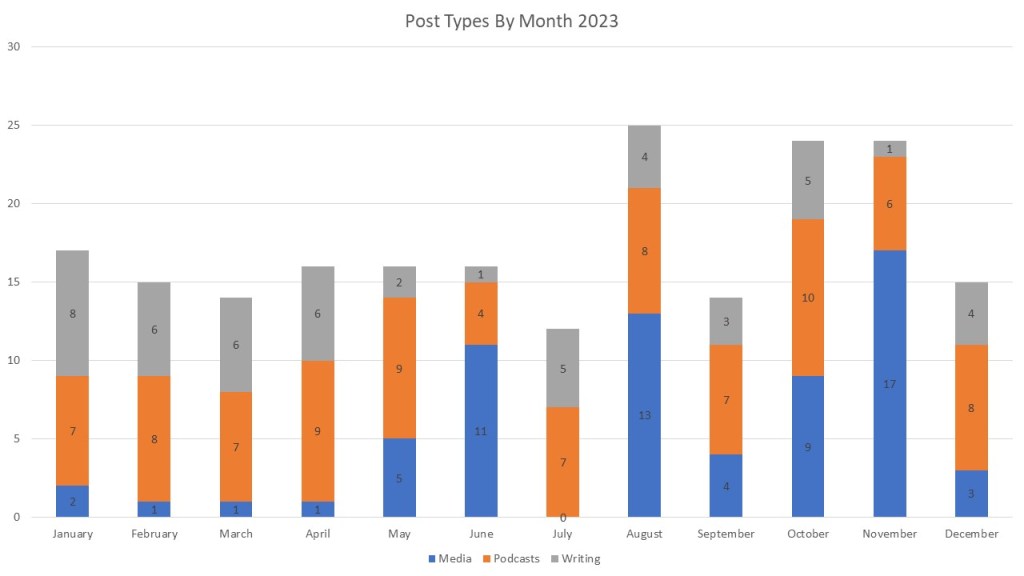 When I look back at the monthly activity The largest amount of activity was in the month of August, with 25 posts. It is also the most balanced month, since it was not the biggest month for any category. The largest month for writing was January with 8 offerings as I wrapped up the 2022 election year and had a few pieces of testimony. The largest month for podcasts was October with 10, as I tried to get as much information out about the general election as possible. The largest month for media was November with 17, as might be expected. As election results are released over the month of November, I tend to be asked to be part of interviews during the post-election period.