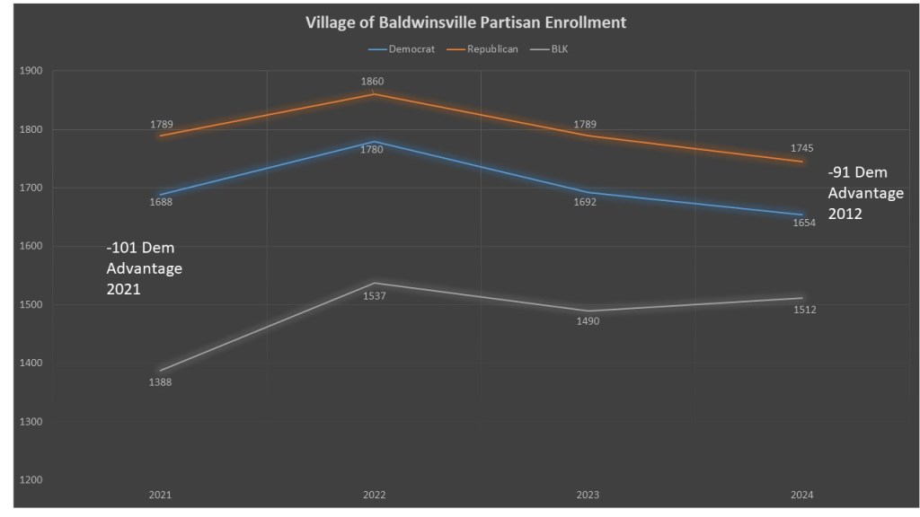 The Baldwinsville races are not running on partisan lines, so I won’t do comparative races, but we can still get a peek at how Baldwinsville is trending. This is my first look at Baldwinsville as it is the first time the Onondaga County Board of Elections has run its elections. However, since we did not run their elections, I also have limited data for them, only going back to 2021. In this short interval both major parties’ lost voters in the post 2020 environment (GOP -44, Dem -34) though the Democrats lost less. This Slightly closed the gap from -101 o -91. The story here is that the non-enrolled is all the growth in Baldwinsville, growing by 124 voters.