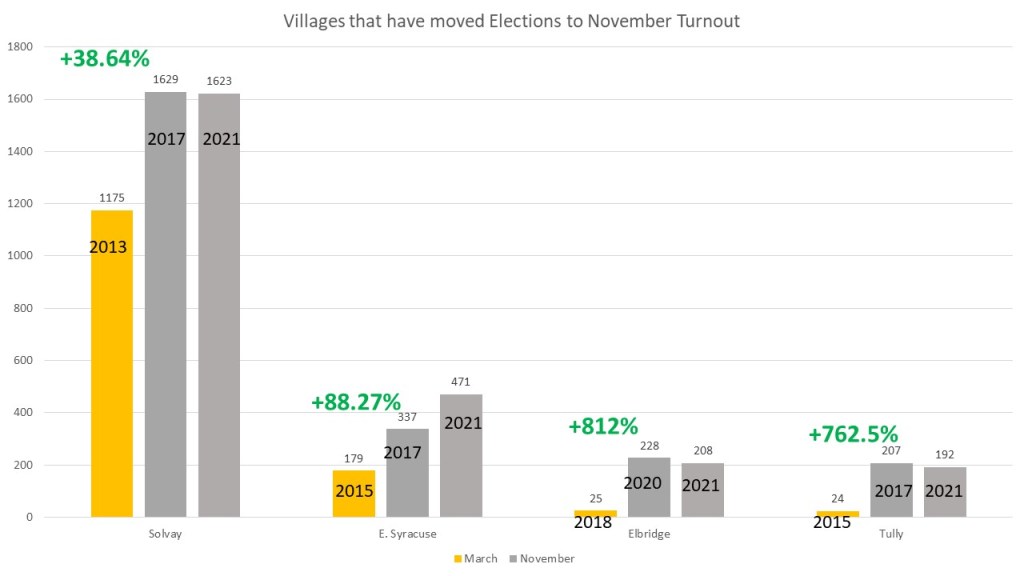 In the last slide I wanted to give some data regarding the moving of villages to November elections. In 2016 The Onondaga County Board of Elections made moves to make it possible for all villages to move to November elections if they chose to do so. If a village moved their election, they could save 100% of the cost of running an election as opposed to March and June. Baldwinsville and Fayetteville have propositions to do just that this year. Some of the opposition to the propositions have said village elections would get lost and that less voters would vote in them. That, statistically speaking, is not true. Since 2016 four villages oved their elections from March to November, Solvay, E. Syracuse, and Tully in 2016 and Elbridge in 2019. I decided to compare votes cast in the races before the change and after. This is not voter turnout, but actual votes cast in village wide races. All four villages not only saw dramatic turnout in the first election, but it was also sustained after. Solvay saw a +38.64% increase in its Mayoral elections. E. Syracuse saw a +88.27% increase in its Mayoral election. Even non-contested elections had massive turnout increases. Tully and Elbridge had +762.5% and +812% increases. This may be why Syracuse.com issued an editorial today endorsing the moves to November, as they did in 2016.