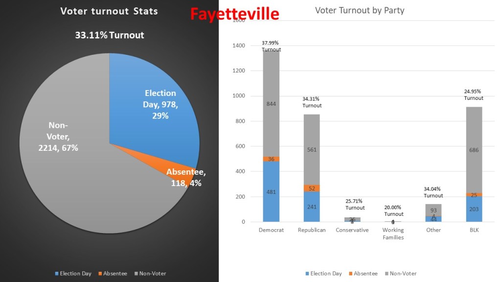 The village of Fayetteville had 1096 voters in the March 2024 Election. This follows a trend of higher-than-average turnout for village elections, in Fayetteville. 33.11% turnout was recorded which rivals odd year November elections but still falls far below even year November elections. Fayetteville voters took more advantage of the new Early Voting by Mail options with 118 voters choosing to vote by mail. That represents 4% of the village and 10.77% of the voting electorate. Democrats are the ascendant party in Fayetteville and were slightly more enthused than GOP voters. Democrats had 37.99% turnout compared to 34.31% for the GOP, and 24.95 % of the non-enrolled.