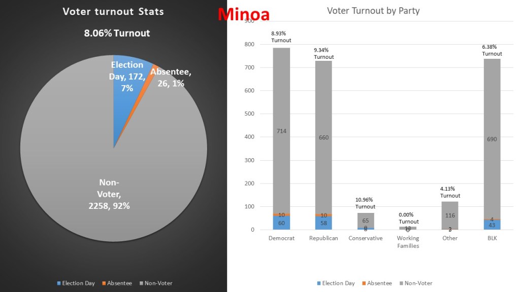 The village of Minoa had a more typical March village election. There was no competition for the village trustee races and no proposition to move the election, only a proposition about volunteer firefighter service awards. This lack of competition resulted in an extremely low turnout. Overall turnout in the Minoa village election was just 198 voters or just 8.06%. Only twenty-six voters chose absentee, about 1% of the village and 13.13% of the electorate. 172 voted on Election Day, about 7% of the village. Democrats had 8.93% turnout and GOP 9.34% while the non-enrolled trailed at 6.38%.
