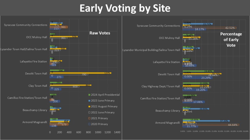 Dewitt Town Hall (296 25%) was the largest turnout as usual, followed by Clay Town Hall (253 21%) which made up the heaviest usage. The next four sites were all Moderate usage: Armond Magnarelli (163 13%), Camillus Fire Department (133 11%), OCC Mulroy Hall (110 9%), & Lysander Municipal Building (103 9%). The smallest sites once again belonged to Beauchamp Library (75 6%) and Lafayette Fire Station (70 6%). Dewitt Town Hall and Clay town hall continue their ranks over the years of being top sites when they are selected as sites for primaries. Beauchamp and Lafayette Continue to be the lowest performing over the years. However, site performance is not the only reason to select a site, Lafayette Fire Station services voters in the southern part of the county and Beauchamp in the inner city.
