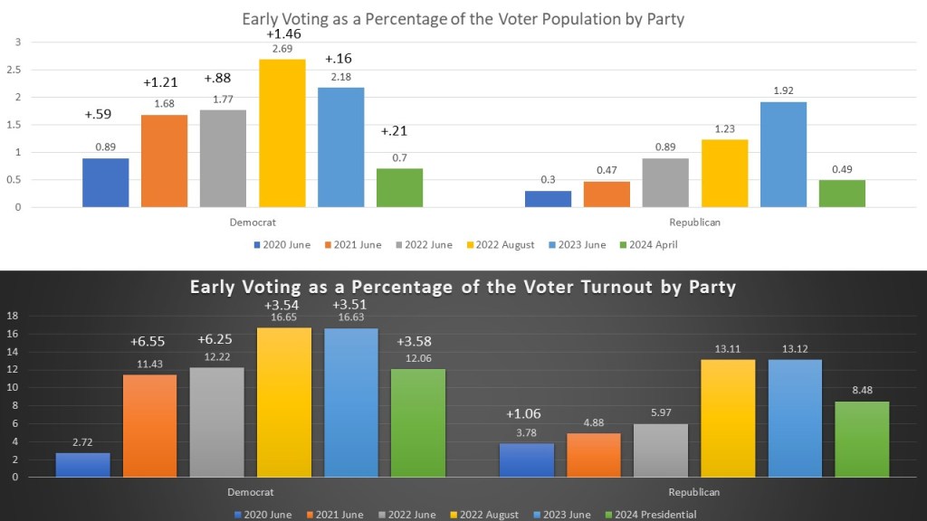 Early Voting took a bit of a hit this primary in terms of raw voters and percentage of the overall vote. Primaries are imperfect elections to compare to each other in the raw vote totals. There are different numbers of eligible voters for each primary. In the 2024 Primary all GOP and Democratic voters were eligible. The best comparisons are the two primaries from 2022. 1208 Early Voters in 2024 compared to 2761 in June of 2022 and 4154 UN August of 2022 shows what a low turnout election this was. However usually even in low turnout over the last five primaries we had seen usage of Early Voting grow in terms of percentage of overall vote. However, 2024 we saw that percentage dip to just 10.58%, the lowest since 2021. There are clues as to why this was the case later in this article.
