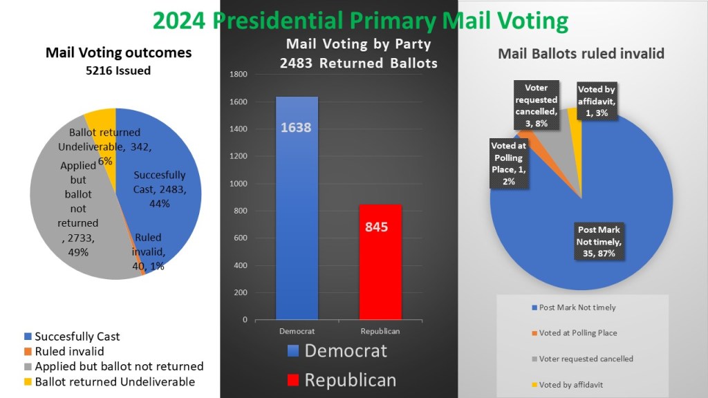 As we look to mail voting there is an interesting story to tell. There are new options for voters when it comes to voting by mail this year, starting with this primary. There is an Early Vote by mail option which eliminates the excuses that absentee voting requires. However absentee voting is still an option as it is a permanent option for every election as opposed to EVBM which must be selected each year. In purpose of reporting and tabulating they are done together in our system as Mail in voting. We issued 5216 mail ballots for the 2024 primary. 2483 were successfully cast &2733 were never returned. 342 ballots were returned undeliverable to the address on file and an additional 40 were rued invalid. Of the 40 ruled invalid 35 were because the postmark was after Election Day, 3 were because the voter wanted to cancel the ballot after returning, 1 because they voted in person at a polling place, and 1 because they voted affidavit. Of the 2483 successfully returned ballots Democrats had 1638 (66%) and the Republicans had 845 (34%).