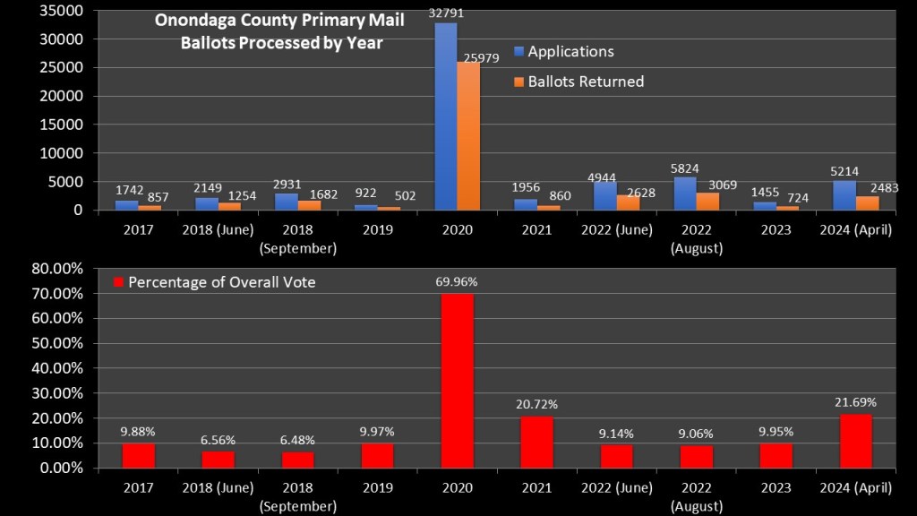 When looking at mail balloting by year in terms of raw numbers it is comparable to the two previous similar primaries in 2022. 2483 ballots returned out of 5214 ballots requested is like 2022 June (2628/4944) and August (3069/5824). However, where this primary stands out is the percentage of the overall vote that was cast by mail. The 2024 primary had 21.69% of the overall ballots cast were cast by mail. This is the highest percentage since the record of June 2020 in the middle of the pandemic which saw 69.96% of the ballots cast by mail. There are several reasons why this occurred. The EVBM option made it easier to chose mail in balloting. The postage paid option removed a barrier to casting ballots. However, the biggest reason may be that when mail ballots were sent out in mid-February the Presidential primary still had active candidates on both sides of the aisle. Nikki Haley and Dean Phillips pulled out after the Super Tuesday contests in early March which made the April 2nd primary in New York fait accompli. This made Early Voting and Election Day turnout smaller than normally expected increasing the returned absentee influence on the election.