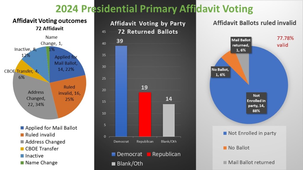 The last form of alternative voting is voting by affidavit balloting. Affidavits are cast by voters who are not listed as active voters at their current address when they show up in person to Early or Election Day. In the 2024 Presidential primary we had 72 voters who voted by Affidavit. 54 ballots were ruled valid: 22 were voters that changed their address, 14 were voters who applied for but did not return a mail ballot, 8 were voters classified as Inactive, 4 were CBOE transfers from other counties, and 1 a name change. Of the 72 Affidavit ballots 39 were Democrat, 19 Republican, and 14 were of voters by another party. Since New York is a closed party state, all non-Democrat and non-Republican affidavits were rejected, and the voters properly registered for future elections. In addition, 1 voter had already returned a mail in ballot and 1 voter returned an affidavit envelop with no ballot. That means 77.78% of all affidavit voters had their ballots accepted and counted.