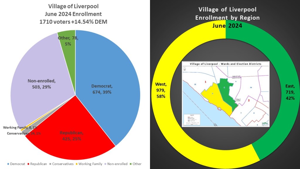 The Village of Liverpool has 1,710 active voters making ranking it 8 out of 15 villages in Onondaga County. Democrats make up 674 voters or 39% of the active registered voters making it the plurality of the district. The GOP has just 425 voters (25%). The non-enrolled are in second place with 503 voters (29%). The Democrats have a +14.54% enrollment advantage. There are only two Election districts that make up Liverpool. Election District 3 is the west portion of the village with 979 voters (58%). Election District 4 is the eastern portion of the village with 719 voters (42%).