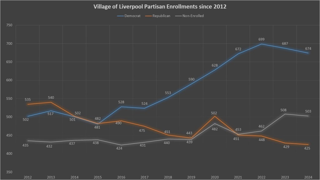 The Village of Liverpool was once a GOP stronghold but has transformed tremendously since 2009. This once blood red Village is now dominated by Democrats. The GOP has now fallen to third place behind the non-enrolled. Like other areas of the county the Democrats had a dramatic rise during the Trump’s Presidency from 2016 to 2020 Democrats gaining 100 voters, the Gop gained just 12 voters and the non-enrolled gained 79 voters. Since 2021 Democrats continued gaining 46 voters, the GOP has lost 77 voters, and the non-enrolled gained 21 voters.