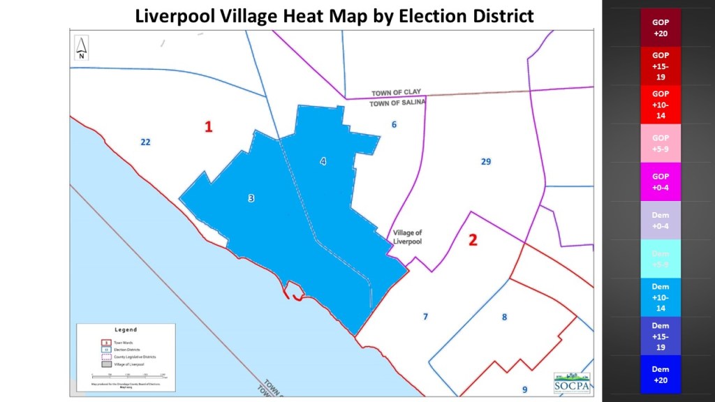 Last year I introduced heat maps as a way of showing the complex makeup of the political subdivisions that will have races this year. The village of Liverpool has only 2 Eds and they both fall into the solid Democratic camp (Dem +10-15%).