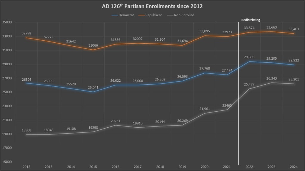 The Central NY Assembly districts were redistricted in 2022 by the Assembly, and then again in 2023 by the NYIRC by court order. However, the second round of maps were similar to the 2022 maps. Redistricting added Democrats and non-enrolled to the district. Since 2021 Democrats gaining just 1,448 voters, the GOP gained just 430 voters, and the non-enrolled gaining the most with 3,736 voters. Most of those gains came in 2022 during redistrict with Democrats and the Gop basically being in stagnation since, though the non-enrolled continues to gain.
