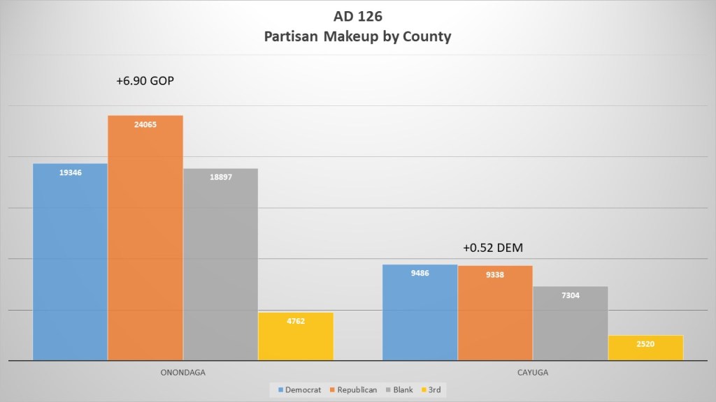 NY Assembly District 126 has 95,718 active voters as of June 2024. Democrats make up 28,922 voters or 31% of the active registered voters of the district. The GOP makes up the plurality with 33,403 voters (36%). The non-enrolled are third with 26,201 voters (28%). The GOP has a +4.68% enrollment advantage. NYAD 126 is divided into parts of two counties, Cayuga, and Onondaga. The Cayuga portion is the part of the southern portion of the county and is 30% of the assembly district (28,648 voters). The Onondaga is the Western and southern towns and make up 70% of the assembly district.