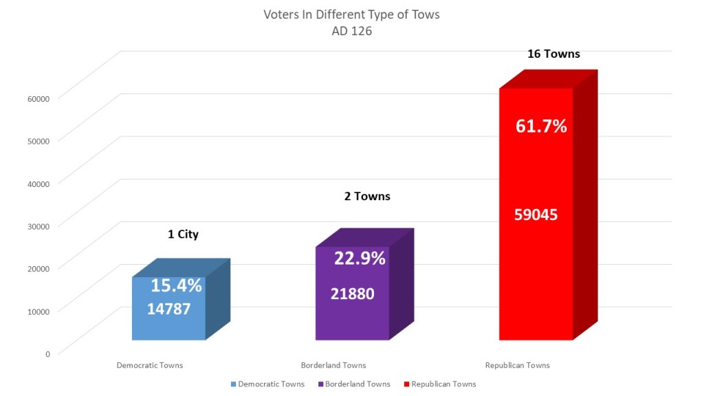 This year in addition to the heat map I looked at the number of towns that lean to each party and the border towns. Here the makeup of the Assembly district both in number of jurisdictions and in population is decidedly red. 16 Towns with 59,045 voters are lean GOP representing 61.7% of the voters in the district. Only two towns with 21,880 voters representing 22.9% of the voters in the district are in borderline towns. Only the City of Auburn with 17,787 voters and 15.4% of the district is the only subdivision with a Democratic lean.