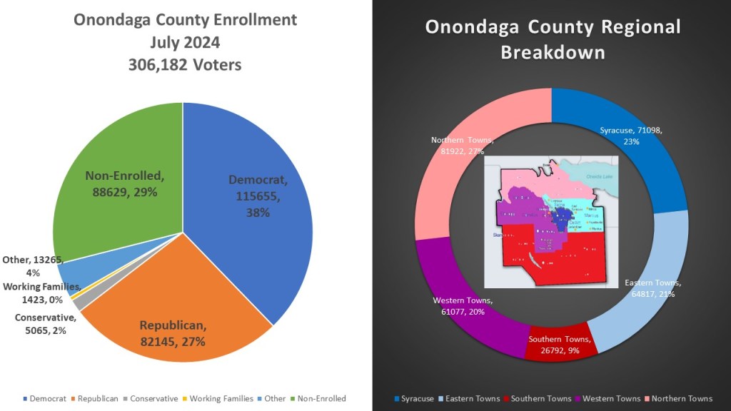 We have 306,182 active registered voters in Onondaga County as of the close of July 2024. Democrats make up 115,655 (38%_, Republicans 82145 (275, non-enrolled 88629 (29%), Conservatives 5,065 (2%) Working Families 1423 (<1%) and 13,265 are in various other not recognized parties (4%). For the purposes of this article, I am breaking up our county into five distinct regions. We have the city of Syracuse (71,098 voters 23%) in the center. The northern towns of Cicero, Clay, and Lysander (81,922 27%) is the largest region. The Western towns of Camillus, Elbridge, Geddes, Onondaga, & Van Buren (61,077 20%) are grouped together. The Eastern grouping of towns is Dewitt, Manlius, & Salina (64,817 21%). The largest collection of towns and acreage belongs to the southern group of Fabius, Lafayette, Marcellus, Otisco, Pompey, Skaneateles, Spafford, & Tully (26,792 9%) also has the fewest number of voters.
