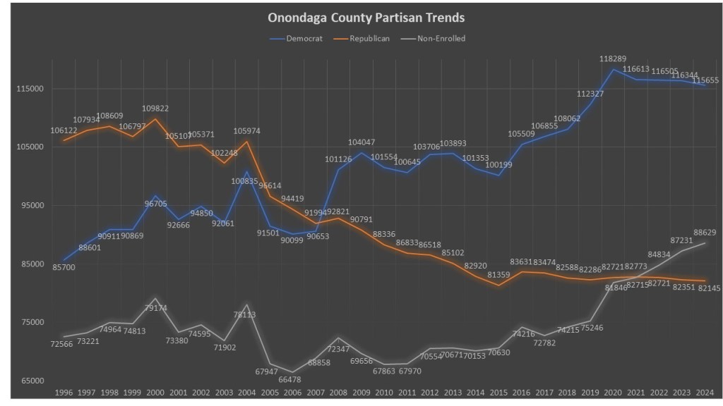 The NYS Election reforms in 2019 made it easier to register to vote and we have seen that in the growth of voters in Onondaga County which exploded in 2020 topping out at 308,296 voters. The current voters pf 306,182 represent the highest total since 2020 and second highest since records I have going back to 1996. After Presidential elections voters fall off the election roles falling inactive and eventually off the roles entirely as mail check cards as well as registration changes take effect and outweigh new registrations. It is likely that after the Presidential election is finished, we will challenge the 2020 record as new registrations pick up over the next 90 days.