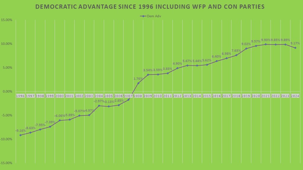 Straight partisan advantage is not the only story in our county. We have four recognized parties in our state: Democratic, Republican, Conservative, and Working Families. Fusion voting allows candidates to run on multiple lines at the same time. Traditionally Democrats and Working Families join forces while the GOP and Conservatives support the other candidate. Conservatives have more voters than the GOP. This slide represents the Democratic advantage in the county by pairing these parties together and comparing the percentage to the overall county voter. As we can see since 1996 the Democrats have reversed the county lean from favoring the GOP by 9.16% in 1996 to favoring the Democrats by 9.17% currently. However, there is cause for concern for Democrats. The current percentage of 9.17% is the lowest since 2019. As the General election campaign heats up this will be a good statistic to check in on right before the November election.