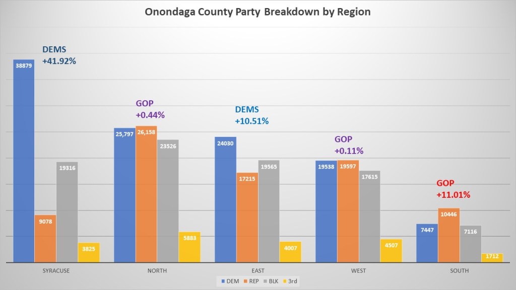 Taking a look at the partisan makeup of the regions of Onondaga County we can see why this is an extremely competitive county. The City of Syracuse is the most Democratic with Democrats having a +41.92% enrollment advantage. On the other side is the southern region where the GOP has a +11.01% advantage. The eastern towns are the best region outside of Syracuse with a +10.51% for Democrats. The Western and Northern regions though are nearly deadlocked. The GOP has the slightest of edges in these regions with a +.44% edge in the North and a +.11% in the west.