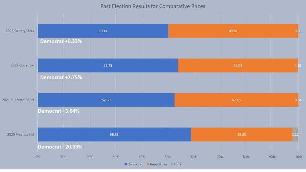 We have a new entry in the top four races that we will look at to see how a political division may react. The 2023 County Clerk race replaces the 2019 County Clerk race as a close race county wide. Emily Essi won the County Clerk for Democrats by .33% and is a good indication of how our county reacts as a baseline in odd low turnout years. In 2022 Governor Kathy Hochul won Onondaga County by 7.75%, with Hochul winning the state by just 6.34% Onondaga County makes a good case for being a bellwether county for statewide offices. Anthony Brindisi failed to win a Supreme Court seat but won Onondaga County by 5.04% representing a solid result for Democrats in an odd year. Of course, President Biden’s win in 2020 represents a theoretical high for Democrats as he won the county by 20.03%.