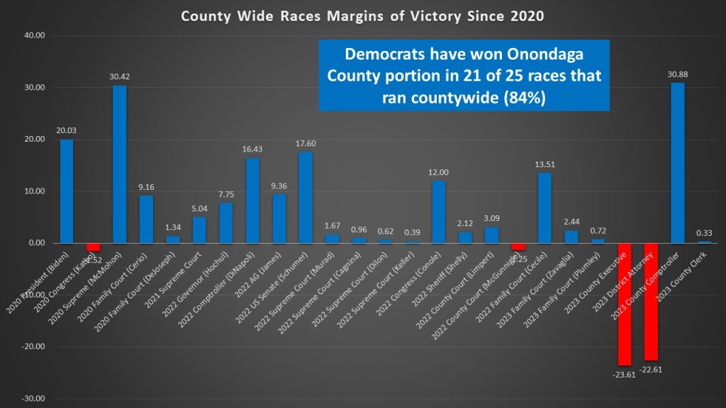 Finally, we check in on how Democrats have done in county wide races over the last four years. These totals represent races that spanned the entirety of Onondaga County though they may and often do span beyond our county. These totals represent only the portions inside our county. We see that Democrats have been on quite a roll over the last four years. 21 of 25 county wide contests have voted for the Democratic candidate inside Onondaga County. This includes last year, 2023 where Democrats carried 4 of 6 seats. Last year also had three of the widest disparities with County Executive Ryan McMahon winning re-election by 23.61%, DA William Fitzpatrick winning his race by 22.61%, and County Comptroller Martin Masterpole winning his re-election by 30.88%. However, when looking at the family court results the Democrats have won the last five seats and now represent all 5 Onondaga County Family Court seats.