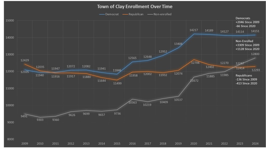 When we look at the partisan trends in Town of Clay, we see the beginning of what might become a Democratic town. The Democrats have gained considerably since 2009 adding 2,046 voters. In the same time period, the non-enrolled have added an outstanding 3,309 voters. The GOP has lost 136 voters since 2009. One of the things I am tracking this year is how subdivisions have changed since the last Presidential election. Democrats have lost sixty-six voters in the Town of Clay and Republicans have lost 413. The non-enrolled continued to gain, adding 1128 voters. So far in 2024 the bulk of new registrations have just started to come in and this data does not reflect registration data in parts of August. There is evidence so far that Democrats have started to see an increase this year and republicans have continued to fall while non-enrolled continue to grow at the fastest rate. We will see if that trend holds at the end of the year.
