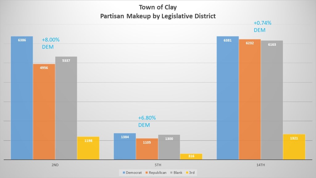 Taking a look at the partisan makeup of the legislative portions we see a slight blue leaning in two out of the three. The 2nd Legislative district portion on the west side of Clay has a +8.00% Democratic lean and the non-enrolled actually outnumber the GOP. We see a similar ratio in the fifth legislative district portion in the southeast corner of the town with the Democrats having a +6.80% lean and the GOP once again coming in third place. The 14th legislative district is about as even as possible, with Democrats having the smallest of advantage at +0.74% and less than 225 voters separating the Democrats, GOP and Non-enrolled.