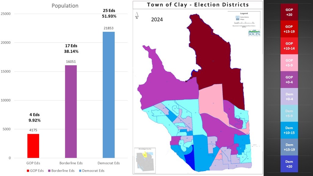 With that we check in on the heat map for Town of Clay. For the heat map we look at the forty-six election districts inside the Town of Clay. It may surprise readers that there are only four election districts with a definitive GOP lean in the Town of Clay. Those eds on the heat map are in the pink or red. Another seventeen are considered borderline with purple on the GOP side and lavender on the Democratic side with less than a 5% lean towards either party. Twenty-five of the eds have Democratic lean and are in various shades of blue on the map. That means that 4,175 voters live in GOP election Districts (9.92%). 1. 51 voters live in borderline election districts (38.14%). Finally, the majority of the town, 21,853 voters (51.93%) live in election districts with a Democratic lean.