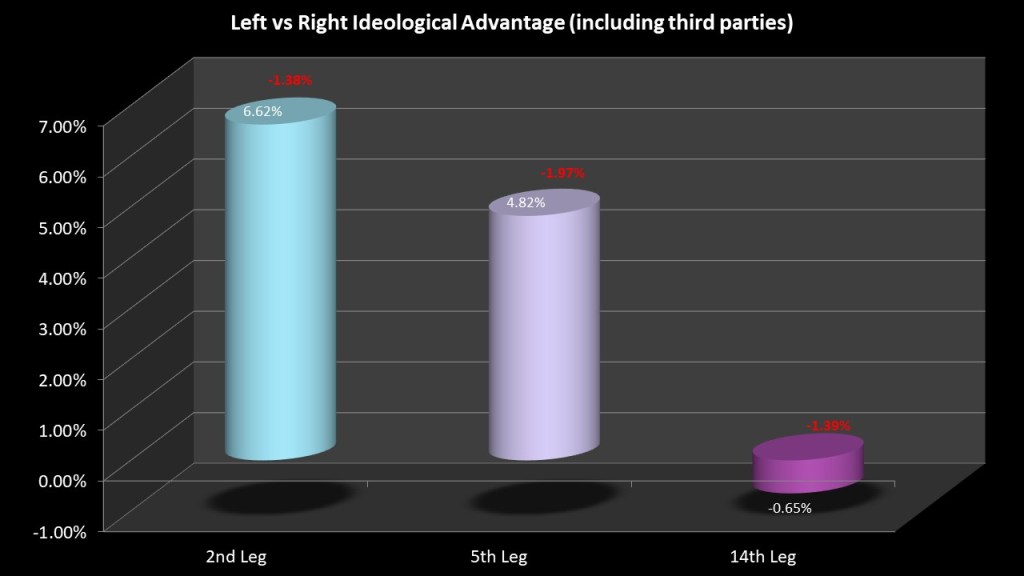 In the towns, however, you cannot just look at the two major parties. The Conservative party plays a large factor in swinging the population to the right. When looking at the three legislative district portions we see that the 2nd Legislative district swings 1.38% to the right when Conservative and Working Families are accounted for. The fifth legislative district swings the largest, 1.97% to the right, and drops that portion down to a borderline Democratic district. The 14th legislative district swings 1.39% to the right and actually flips to becoming a borderline GOP district.