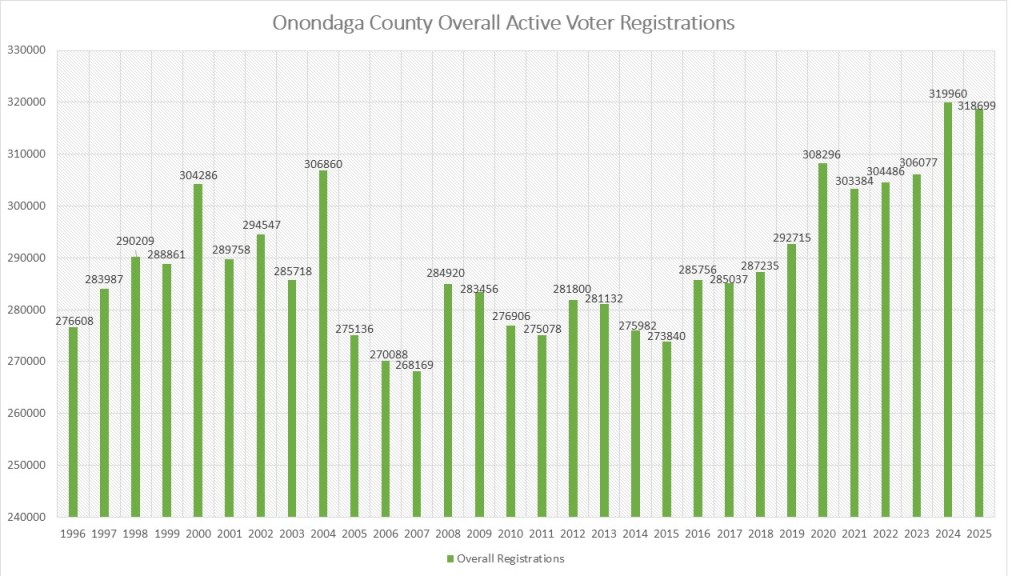 This graph measures the active voter population right before the general election of each year dating back to 1996. As you can see Onondaga County set a record in 2024 with 319,960 voters before last November’s General Election. This reflected a decent jump in registration as is normal in a Presidential election (+13,883). However, it paled in comparison to the jump we had in 2020 (+15,581) but was more than the jump in 2016 (+11,916). We have started to lose voters in 2025 because the new registrations are being outpaced by the deaths and voters being made inactive due to return mail.