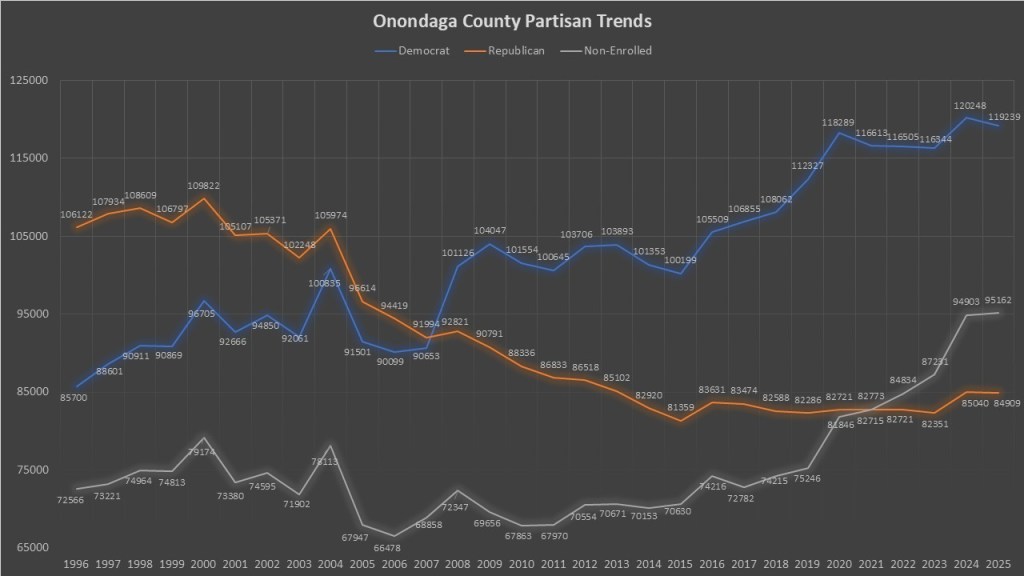 Democrats in Onondaga County continued to outpace the GOP but it’s the non-enrolled that is the biggest story. Going back to 1996 Democrats have added 33,539 voters while the GOP has lost 21,213 voters. The non-enrolled has only added 22,596 voters since 1996. However, if we look at the last four years, the story is different. The Democrats have added 950 voters, the GOP has added 2,188 voters, and the non-enrolled has added an outstanding 13,316 voters. This is a marked change from the previous four years during the first Trump presidency. We will see if this was the result of a democratic administration being in office or the start of a long-term trend. What is no doubt a major force in Onondaga County is the increasing share of non-enrolled voters.
