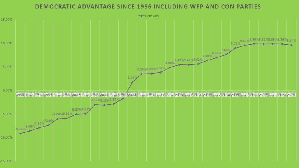 When looking at the Democratic advantage in Onondaga County in terms of overall registration you can not just look at raw numbers of democratic vs. republican. We have two other parties in New York, the Conservative and Working Families. These parties tend to align ideologically with the major parties. The Conservatives sit to the right of the GOP and generally support GOP candidates. The Working families sits to the left of the Democrats and generally support Democratic candidates. If you couple those together and compare them to the overall voters currently the Democrats have a +9.64% in March of 2025. However, despite the GOP faring better in overall registrations, the Democrats held a +9.86% in November of 2024, growing from +9.57% in November of 2020.