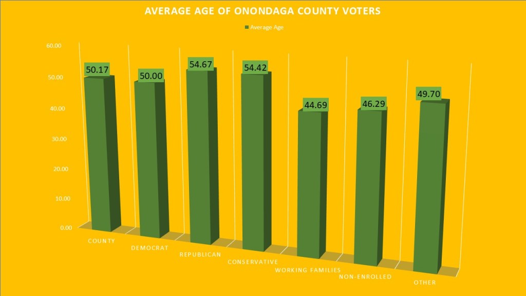 A new facet of analysis this year for me will be the average age of different voting populations inside a political subdivision. Our new registration system has some better features for me to do this analysis and I hope to put them to good use this next year. The average age of Onondaga County active voters is 50.17 years old. Democrats reflect the general makeup of the county with an average age of 50.00 years old. Republicans have the oldest average age at 54.67 years old followed closely by the conservatives at 54.42 years old. The Working families is the youngest age group at 44.69 years old. The non-enrolled population is slightly older at 46.29 years old. The other category is just under the county average at 49.70 years old. I hope to do a deeper dive on age statistics later this summer.