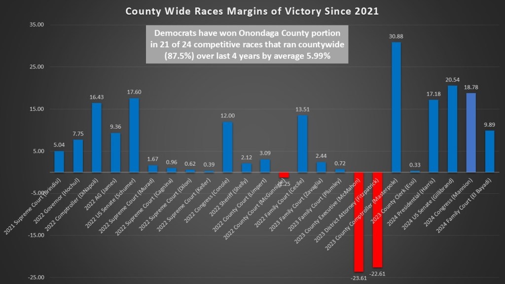 The overwhelming blue nature of Syracuse and solid blue nature of the eastern towns has outpaced the slight GOP leans of the other areas and has led to significant victories for Democrats on a county wide basis. Over the last 4 years there have been 24 competitive races that covered the entire county of Onondaga. These are races where both the Democrats and the GOP fielded candidates. The Democrats have won the Onondaga County portion of those races in 21 of those 24 contests. It should be noted the 2021 and 2022 supreme court races the Democrats won Onondaga County but went on to lose the races in the other counties. 2024 was a banner year for Democrats locally, most notably in congress. John Katko won Onondaga County by 1.52% in 2020. Fran Canole’s congressional campaign won Onondaga County by 12.00% even though he went on to lose the race. John Mannion not only won Onondaga County by 18.78%, but he also outpaced the Presidential ticket and went on to win NY22 propelled by his success here.