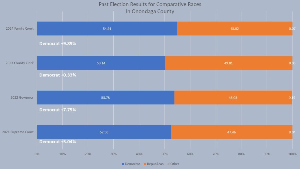 It’s a new year and I have a new set of comparative races that will give us some insight on a political subdivision’s voting habits. For each of the last four years I chose the countywide race that was the closest election in a one-on-one matchup countywide. In 2021 this was Anthony Brindisi’s unsuccessful Supreme Court run, in which he won Onondaga county portion by 5.04% but ultimately lost the race. In 2022 Governor Kathy Hochul won Onondaga County by 7.75%, which was higher than her statewide total but not by much. Emily Essi won the 2-23 County Clerk race in one of the closes county wide elections in Onondaga county history, winning by just .33%. Finally, Christina El-Bayadi won family Court in 2024 by 9.89%. These races in essence show the political leanings of a region based on general party preferences and can by a good gauge to whether a generic Democrat can be successful and under what conditions. We will come back to these in each #weeklywonk throughout the year.