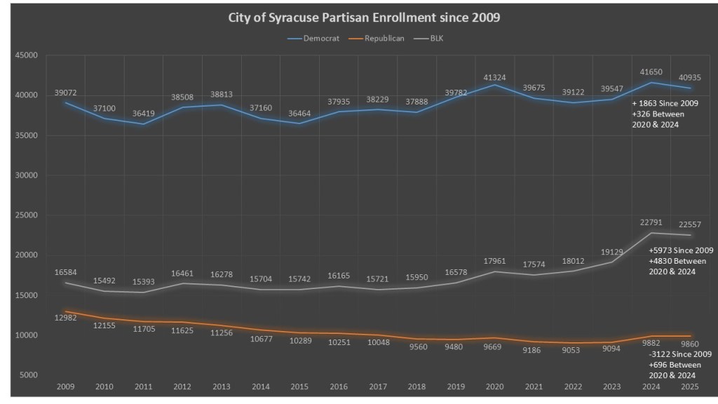The City of Syracuse has long been a Democratic stronghold. However now at the completion of a gull Presidential Cycle we can compare long term trends to a recent short term. Democrats have gained 1,863 since 2009, however between November 2020 and November 2024 they gained 326 voters. The republicans have lost 3,122 voters since 2009, but in contrast they gained 696 voters between November 2020 & November 2024. The big gainer though is the non-enrolled. Not only did they gain 5,973 voters since 2009, but most of that gain also happened between November 2020 & November 2024 with 4,830 voters added. So while it raises an eyebrow that the GOP gained at double the rate that the Democrats did in the last four years, that pales in comparison to the Non-enrolled gain at 7 times the rate of GOP and 14 times the rate of Democrats.