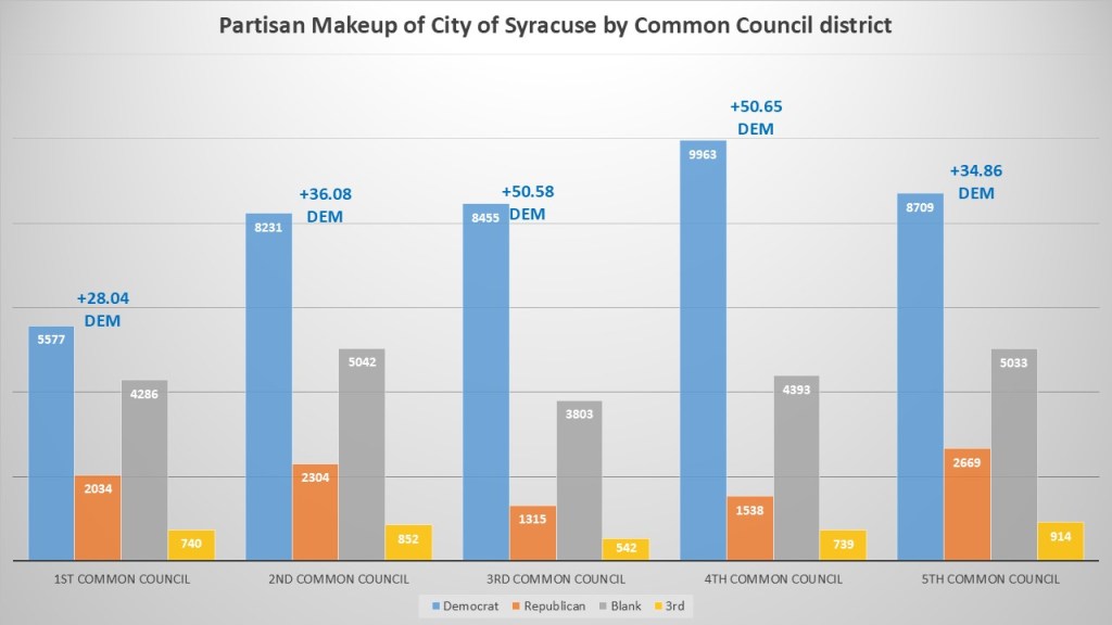 The partisan makeup of the City of Syracuse Common Council districts is all similar in their Democratic dominance, but in varying degrees. In every district the Democrats are well over the other categories, with non-enrolled in second, and the GOP in distant third. The least Democratic dominant district is district one with a +28.04% representing the northside. That is followed by the second common council district at +36.08% which represents the west side of Syracuse. Next is the fifth common council representing Eastwood and Sedgewick at +34.86%. #rd common council district representing the university and east side of Syracuse has a +50.58%. Finally, the most Democratic district is the fourth common council representing downtown and the south side into the valley. At +50.65%.