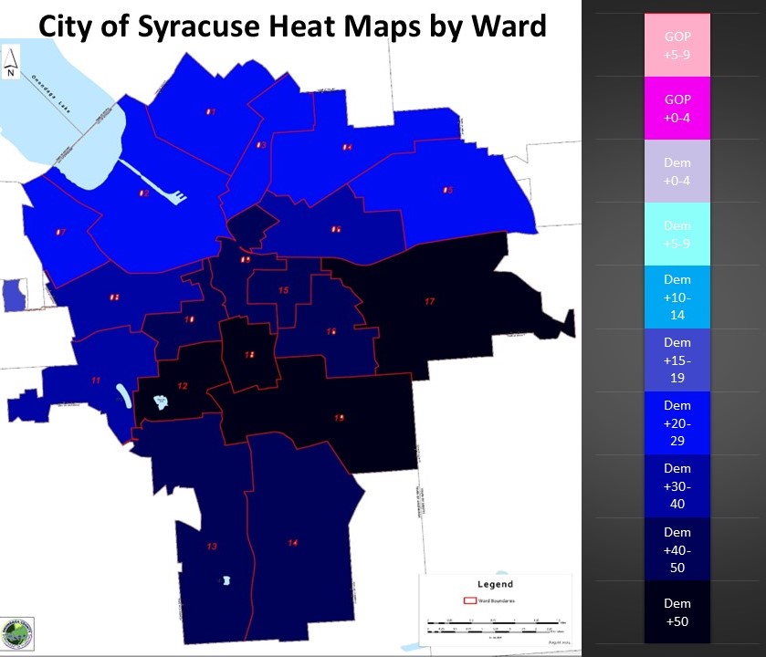 Syracuse is so dominated by Democrats I had to add a few categories for the heat map. For this map we look at the wards of the City of Syracuse and color them based on the degree of Democratic enrollment edges. Wards 1,2,3,7,4, & 5 are the least Democratic wards in the City of Syracuse falling in the Dem +20-29% range. Wards 6, 8, & 11 are in the Dem +30-39 range. Wards 9, 10,13, 14, 15, & 16 fall in the Dem +40-49 range. The most democratic wards are 12, 17, 18 & 19 in the +50-59% range.