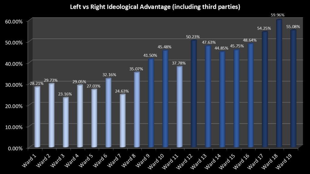 It is helpful to not just look at straight Democratic enrollment edges but to factor in the third parties as well. The Conservative party tends to align with the GOP and the WFP tends to align with the Democrats. Usually, the conservatives outnumber the WFP by a factor of five or more and thus it can swing districts to the right. However, in the City of Syracuse the WFP and Conservatives are essentially tied. That means the wards really do not change much when we look at the ideological leans of the wards when compared to the heat map that just shows the Dem % gain over GOP.